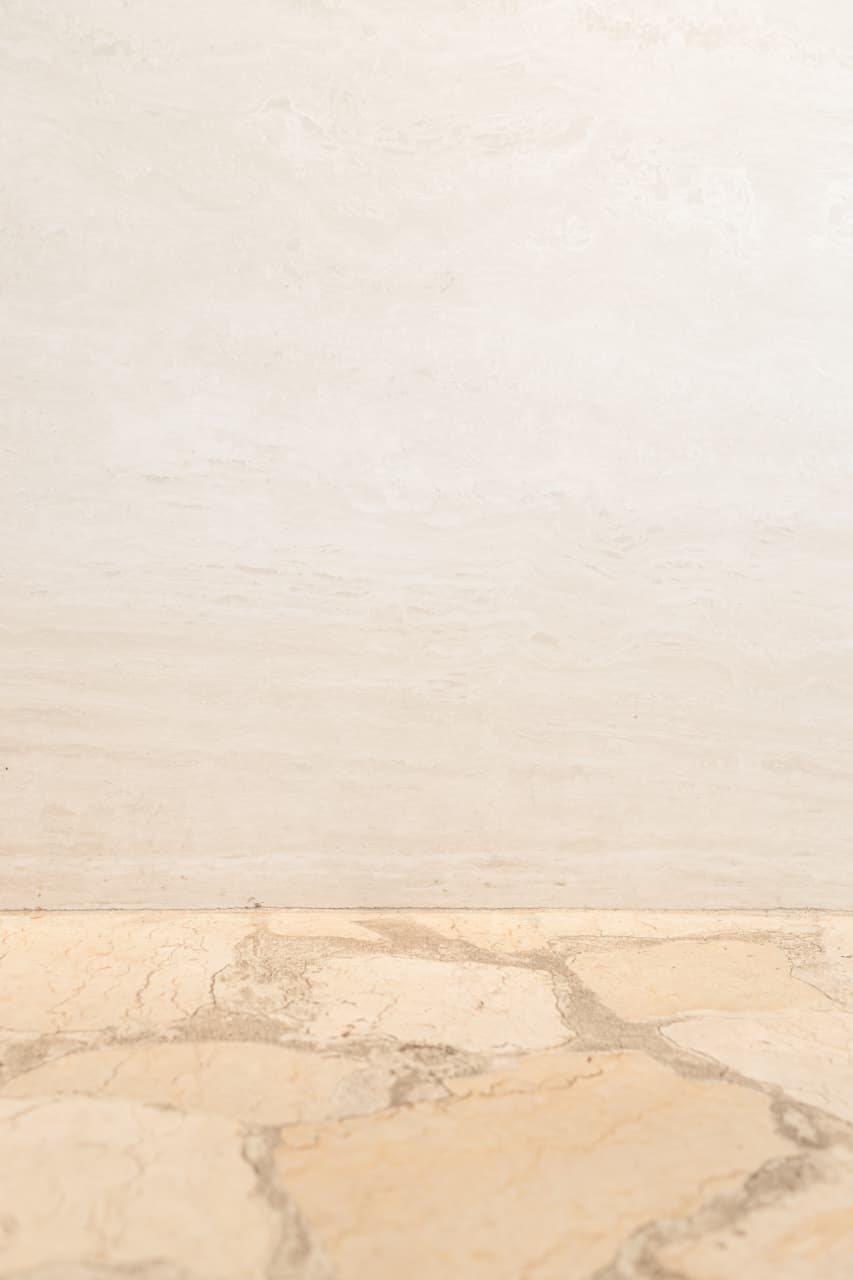The aesthetic is defined by clean lines and neutral tones, establishing a refined monochromatic atmosphere. Stone floors and textured walls evoke the tactility of the outdoors, bringing warmth and familiarity to the interior.