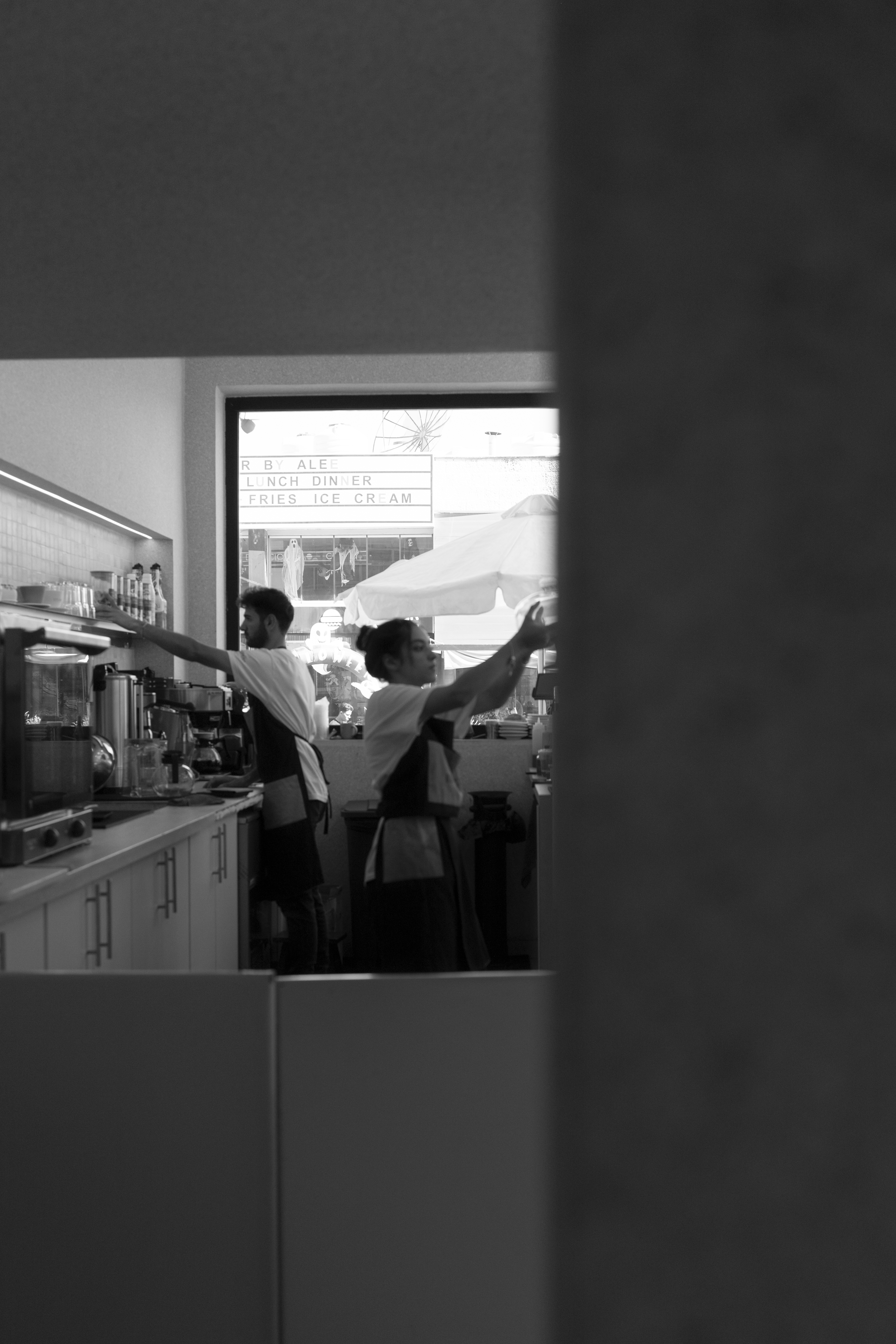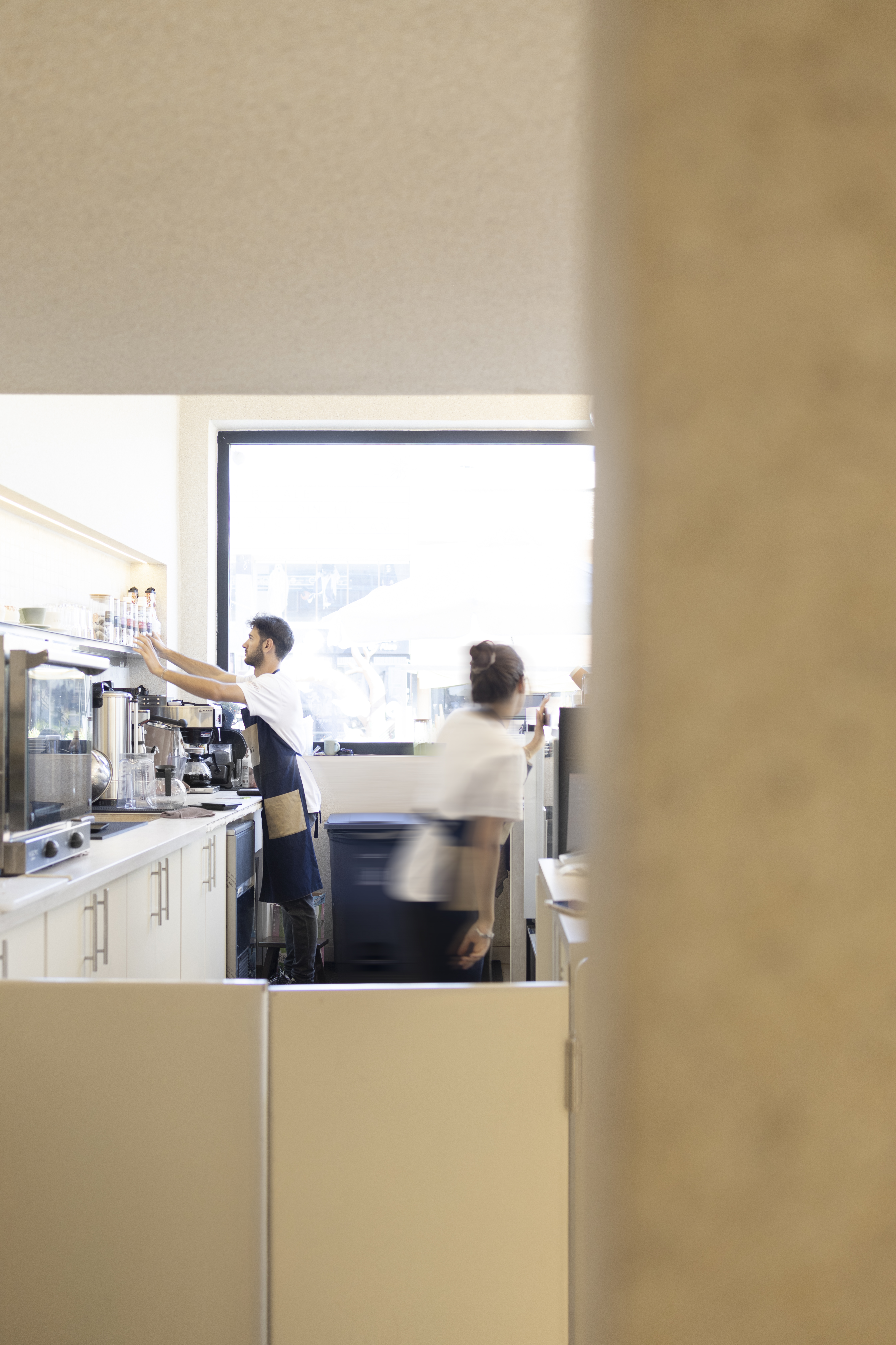 At the entrance, the coffee bar anchors the space. Conceived as a stage, it transforms coffee making and pastry preparation into a performance—celebrating the artistry of food while fostering transparency between staff and guests.